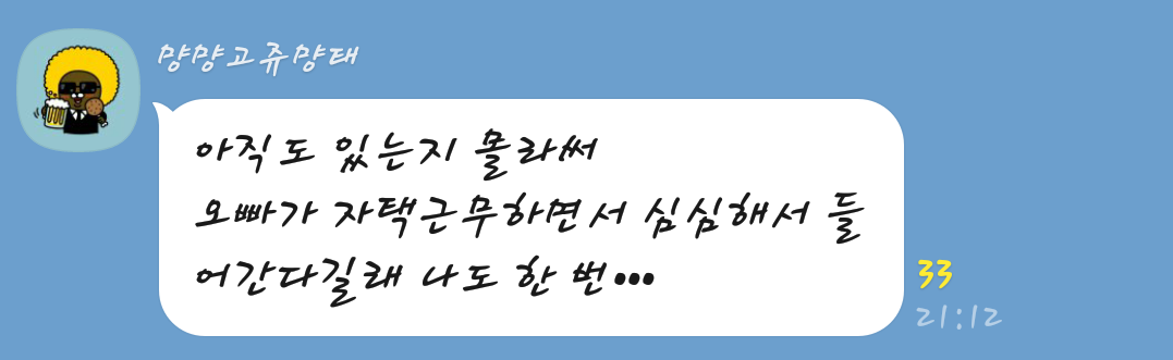 Jyu: Bunun hâlâ buralarda olduğunu bilmiyordum. Oppa evden çalışıyor ve sıkılmıştı, bu yüzden buraya geleceğini söyledi ve ben de buradayım!